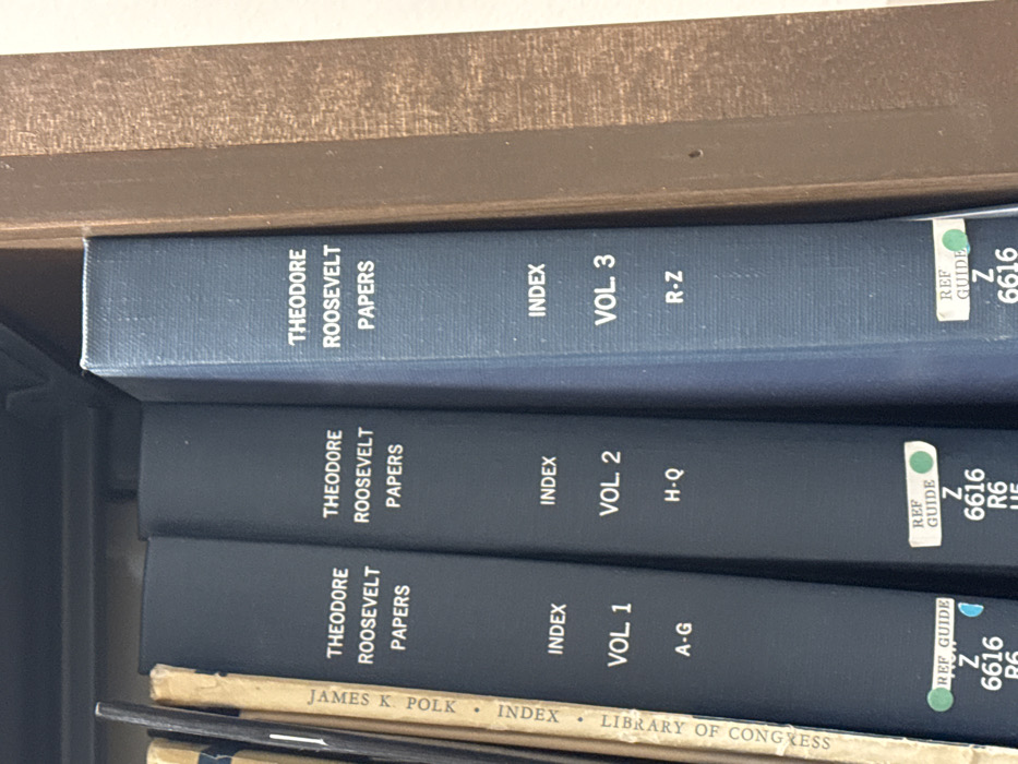 The image displays a section of a wooden bookshelf containing several historical reference volumes, located within an indoor setting in the Town of Vestal, United States. Three prominent dark blue, cloth-bound books are visible, all titled "THEODORE ROOSEVELT PAPERS" and subsequently "INDEX." These are individually labeled as "VOL 1 A-G," "VOL 2 H-Q," and "VOL 3 R-Z" from left to right. Each of these volumes has a white "REF GUIDE" label near the bottom of its spine, marked with "Z 6616" and partially covered by a circular green sticker. To the far left, a tan-colored book titled "JAMES K. POLK INDEX LIBRARY OF CONGRESS" is partially visible. A thin, dark object is situated between the Polk volume and the first Roosevelt volume. The books are arranged vertically on a wooden shelf, with the right side of a brown wooden vertical shelf support visible. No individuals are present, and no actions are occurring.