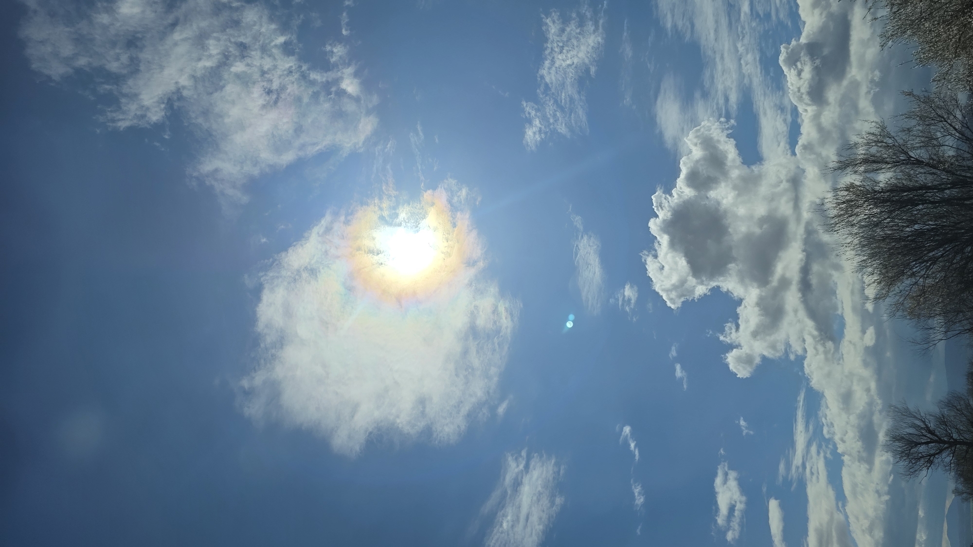 - "bright sun surrounded by a colorful halo in a sky filled with scattered white clouds" by FM-etvNA2, licensed under CC BY 4.0