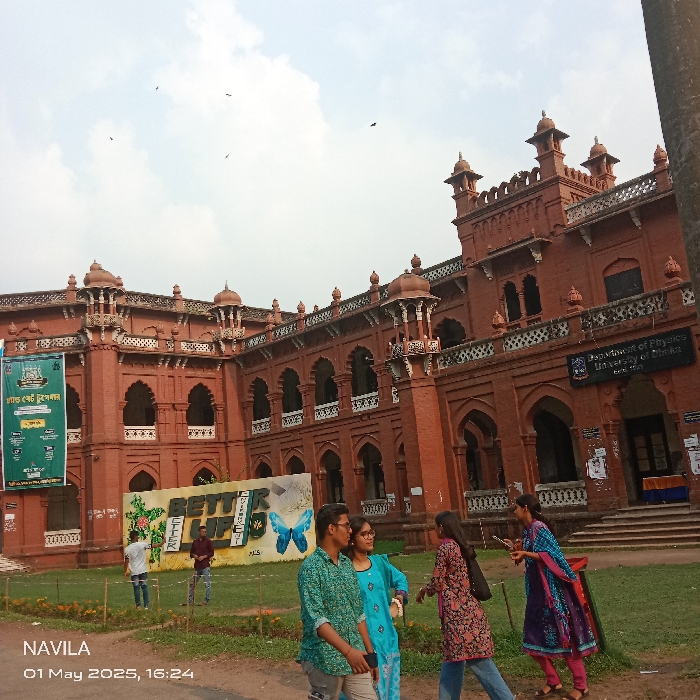 Department of Physics building at the University of Dhaka, Bangladesh. It is a large brick building with arched windows and a tiled roof. There are five people walking along a paved path in front of the building. One man is wearing a blue and green patterned shirt and khaki pants. He is looking directly at the camera. A woman in a blue dress is walking next to him, looking to the right. Behind them is another woman, wearing a red and white dress and looking toward the left. Two other women are further down the path; the one closer to the camera is wearing a purple dress and the other is wearing a white dress with floral patterns. There is a large billboard in front of the building with the text "BETTER LIFE." The building is surrounded by grass and trees, and there is a blue sky with some clouds in the background. The timestamp on the image indicates that it was taken on May 1, 2023 at 18:24.