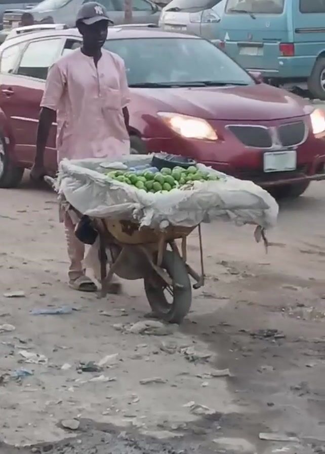 A man in a pink outfit and baseball cap is pushing a wheelbarrow full of green fruits along a dirt road. The wheelbarrow has a white cloth draped over the fruits. Cars and motorcycles pass by in the background. The road is uneven with patches of dirt and some debris.