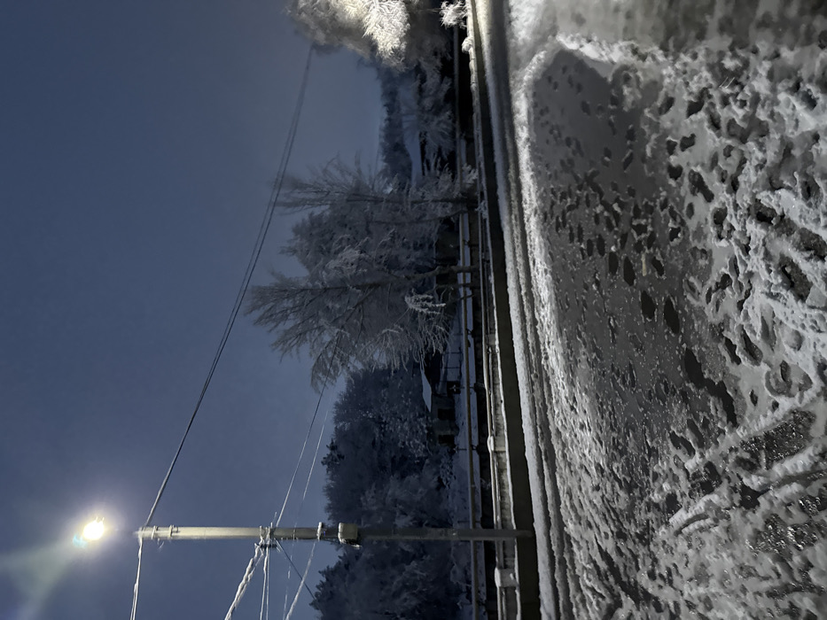 A nighttime street scene with snow-covered trees and ground. A tall street light illuminates the area with a bright glow. Power lines stretch above the trees. The pavement is covered in a layer of snow and ice. The image is oriented with the sky on the left and the ground on the right.
