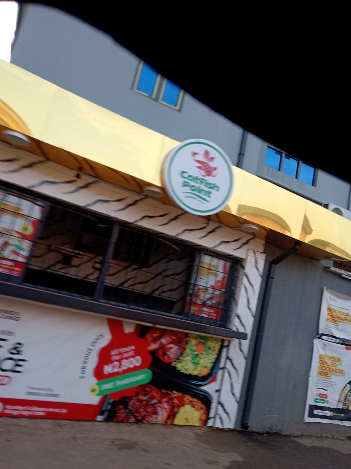A tilted outdoor shot reveals a "Catfish Point" restaurant with a round sign showcasing a catfish graphic and name. The building features a striped pattern above the window and a golden awning. Prominent signage advertises takeout for N2,800, with images of food. Additional posters advertise shawarma and grilled food options. The restaurant is located in a multi-story building with blue windows visible in the background.