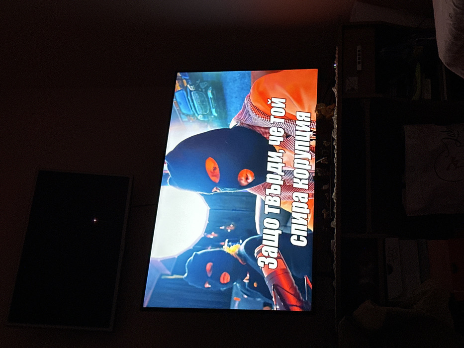 The image depicts a dimly lit interior in Veliko Tarnovo, Bulgaria, featuring two flat-screen televisions mounted on a dark wall