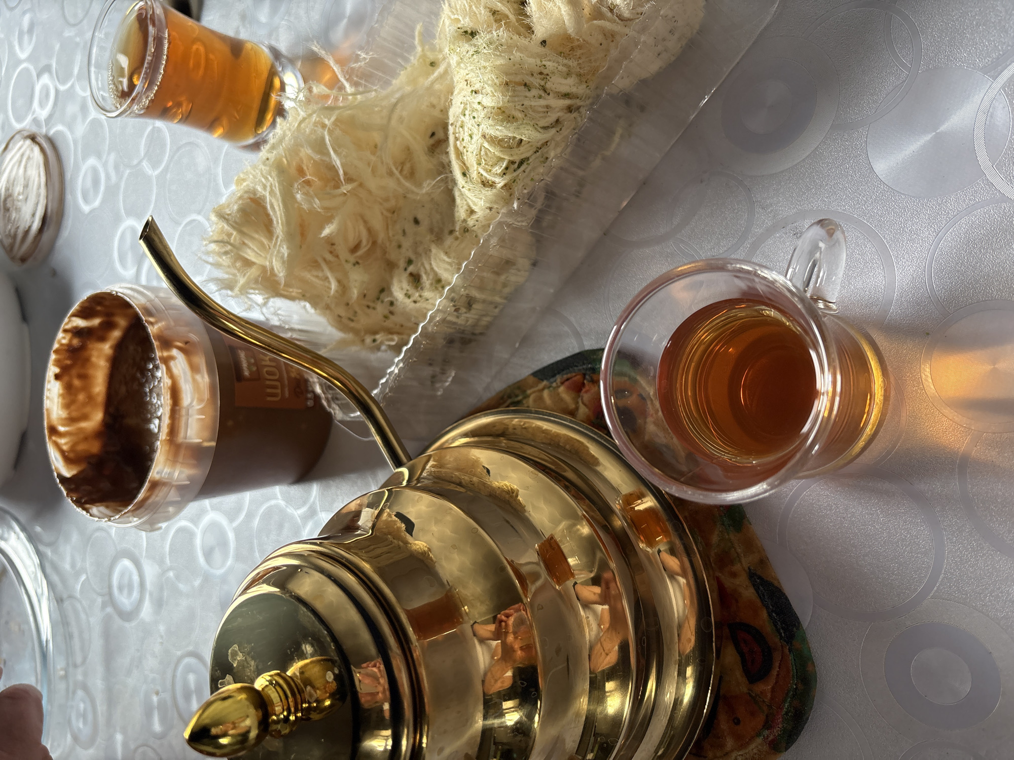 The image depicts a tabletop scene, possibly indoors. Dominating the scene is a polished gold-colored metal teapot with a long, curved spout. A glass mug filled with tea sits to the right of the teapot. In the upper left corner, another glass of tea leans precariously. A clear plastic container holds a mass of pale, fibrous food, possibly cotton candy or a similar confection. A jar of what appears to be chocolate or caramel spread is visible on the left side of the teapot. The background is a textured white surface, likely a tablecloth. The image suggests a tea break or snack time. There is no information regarding the location in the city of Bolsheustyikinskoye, Russia.