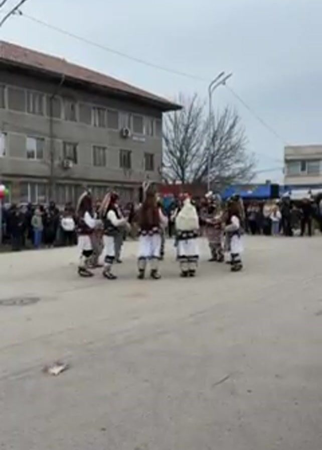 In an eye-level shot under an overcast sky, a circle of people dressed in traditional costumes perform in a town square. The costumes are predominantly white and brown, with tall headwear that appears to be made from animal fur. Each individual is holding what seems to be a percussion instrument, which they are using to create a rhythmic sound. A crowd of onlookers surrounds the performance, standing along the edges of the square. A multi-story building with visible air conditioning units is on one side of the square, while bare trees stand in the background. The ground is paved with concrete. The overall impression is of a cultural performance taking place in a public space.