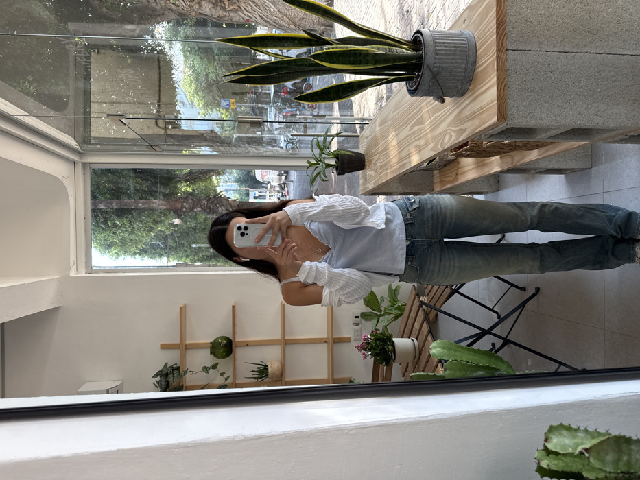 A young female is depicted taking a mirror selfie inside a commercial establishment located in the city of Unknown, Unknown. She has long dark hair, wears a light blue tank top with a ruffled neckline, a white open-front ribbed cardigan, light-wash jeans, and white AirPods. Her face is obscured by the silver smartphone she holds. The interior features white walls and is brightly lit by natural light entering through a large window on the right. To the left, a tall mirror reflects a partial view of a green cactus. Behind the female, a multi-tiered wooden shelf unit displays various potted plants and a green glass vase. Below these shelves, a small wooden slatted table with two dark folding chairs holds a pink flowering plant in a white pot. To the right, a counter constructed from concrete blocks with a light wooden top supports a tall snake plant in a galvanized pot and a smaller dark potted plant. Through the window, an urban street scene is visible, featuring large trees, parked vehicles, bicycles, a blue and white road sign, and distant buildings.