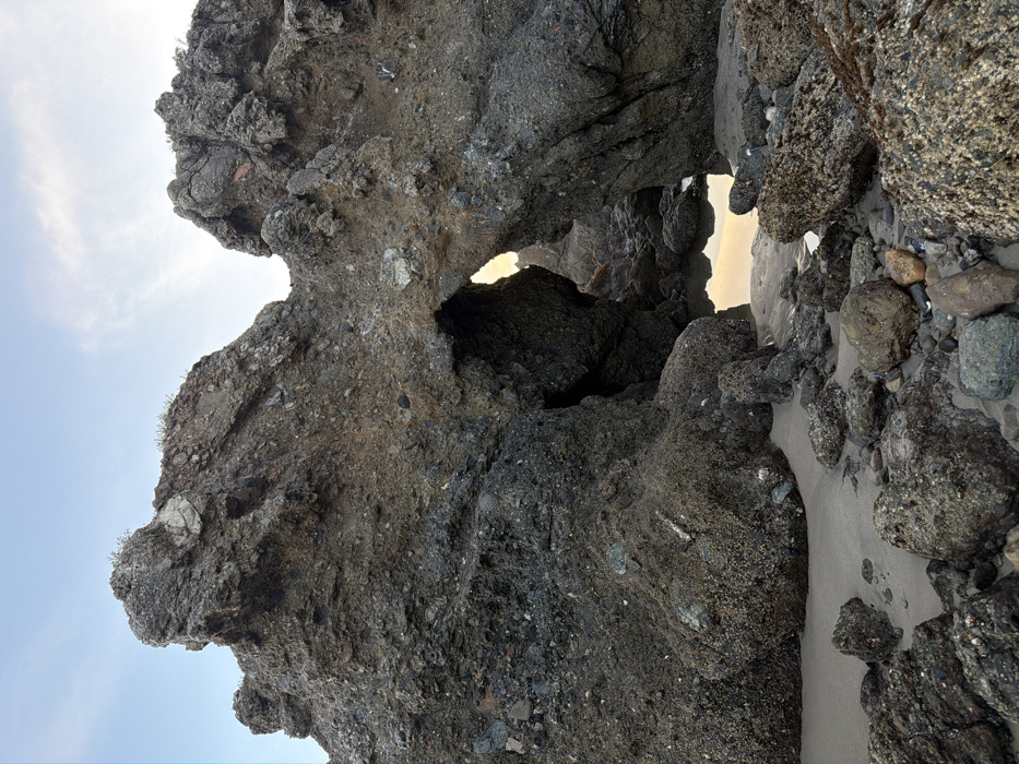A rock formation with holes overlooks a beach. The foreground shows coarse, dark gray rocks, some smoothed, with smaller pebbles and sand at their base. Gaps in the rocks create openings that reveal a distant, sunlit sandy area. The sky is visible through the highest aperture, fading from light blue to pale yellow near the horizon. The image is oriented vertically, with the rocks dominating the frame.