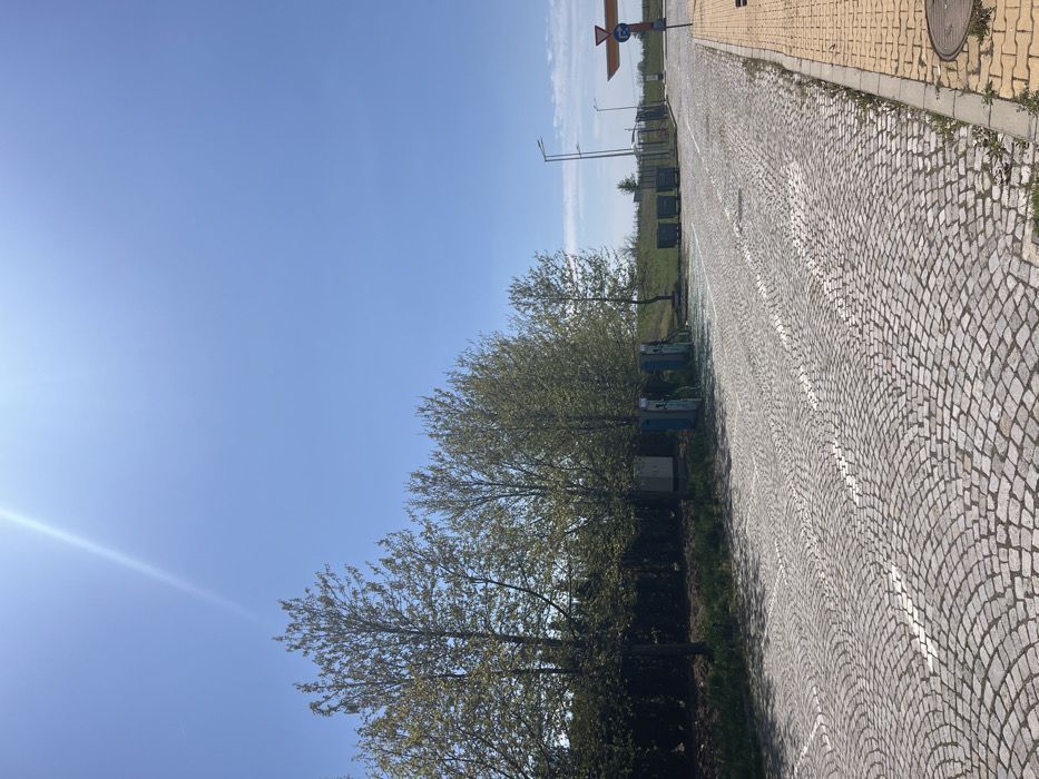 paved parking lot with a cobblestone surface and white painted lines, located in Nova Zagora, Bulgaria, at coordinates 42.463, 26.068. The lot is empty, with the exception of two electric vehicle charging stations on the left side of the frame. There are trees lining the lot, and a green grassy area behind them. In the distance, there are several garbage bins, street lights, and a yellow traffic sign. The sky is clear blue with bright sun. The sun's glare is visible in the top left corner of the image.