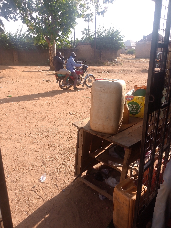 An outdoor scene in Kwang, Nigeria, depicts a dusty reddish-brown dirt ground illuminated by bright sunlight, casting distinct shadows. In the midground, two adult males are positioned on a red motorcycle. The driver, wearing a light blue shirt and dark head covering, has his left foot on the ground. A passenger, dressed in dark clothing, sits behind him, with a green-wrapped object secured to the motorcycle's rear rack. The motorcycle faces towards the right. To the far right in the foreground, a makeshift wooden stand holds a large, cream-colored plastic 25-liter jerrycan and a partially visible yellow package labeled "SUPREME NOODLES CHICKEN FLAVOUR." A smaller, orange plastic jerrycan is visible on a lower shelf, partially obscured by a dark metal grate structure. The background features a large tree with green foliage on the left, several low, unfinished concrete or mud-brick structures, and a distant building with a pitched roof. The sky is bright with a light haze.