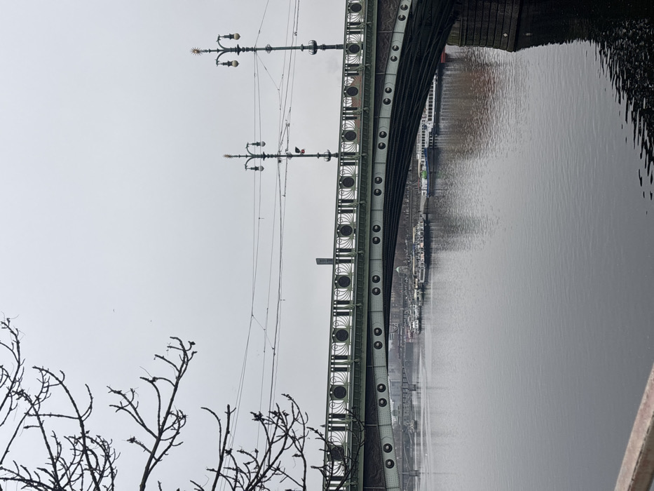 The image captures a view of the Most Legií (Legion Bridge) spanning the Vltava River in the Capital City of Prague, Czechia, under an overcast sky. In the upper-left foreground, bare, dark tree branches extend into the frame. The sky is uniformly light grey, with several small, dark specks, likely birds, visible. The Most Legií dominates the midground, presenting a multi-arch structure painted dark green on its upper railing and a lighter green-grey on its main body, featuring repetitive circular decorative elements and a series of circular rivets along its lower arches. Two ornate, dark lampposts are situated on the bridge deck, each equipped with multiple light fixtures and topped with a golden sunburst finial. Multiple dark overhead electrical wires traverse horizontally above the bridge. Below the bridge, the Vltava River's surface is calm and dark grey, reflecting the sky and portions of the bridge structure. Numerous boats, resembling tour or restaurant vessels, are moored along the far riverbank, extending beneath and beyond the main bridge. In the far distance, beneath the Most Legií, another, smaller bridge is visible. The distant riverbanks feature faint outlines of urban structures. A reddish-brown railing is visible in the lower-left foreground. No individuals or specific actions are discernible within the frame.