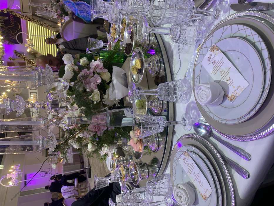 A lavish table setting displays ornate silverware, crystal glassware, and layered plates. A menu card and a napkin folded into a rose sit atop each plate. Reflective silver trays showcase small bowls filled with delicacies. Lush floral arrangements and tall crystal candelabras form the centerpiece. People and decorative lighting are visible in the background, suggesting a formal event or wedding reception. The scene exudes elegance and luxury.