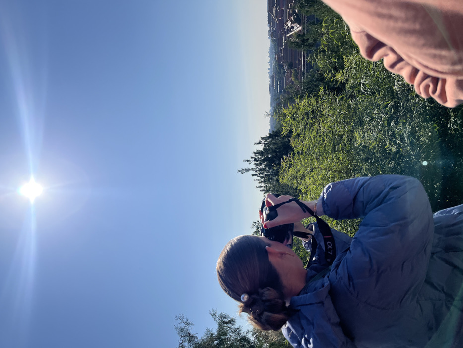 A person is depicted from behind, positioned on an elevated vantage point overlooking a city. This individual wears a light blue puffer jacket and has brown hair styled in a bun, secured with a pearl-like clip. They are actively holding a black Sony Alpha 7 series camera to their eye, aiming it towards the distant urban landscape. Red nail polish is visible on their fingernails. The foreground and middle ground are dominated by dense green foliage, comprising various bushes and conifer-like trees. In the far distance, a vast complex of traditional Chinese architecture with distinctive red-tiled roofs, identifiable as the Forbidden City, is visible, flanked by a modern cityscape on the horizon. The sky is clear and bright blue, with the sun prominently featured in the upper left, emitting a strong lens flare. A partial view of a second person's reddish-brown garment is visible on the far right edge of the frame. This scene takes place from an elevated position, consistent with Jingshan Park, overlooking the Forbidden City in Dongcheng District, China.