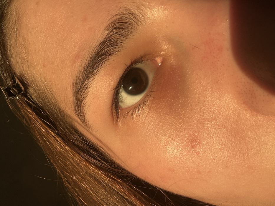 The image displays a close-up, angled view of the right side of a human face. The subject's right eye is centrally featured, showing a dark brown iris, a black pupil, and white sclera. Eyelashes are visible on both the upper and lower eyelids. A dark, full eyebrow arches above the eye. The skin, exhibiting a fair to medium complexion, is illuminated by a strong, warm light source from the upper left, casting a golden-orange hue and highlighting skin texture, including pores. Minor reddish marks are present on the cheek and forehead. Brownish-auburn hair is visible in the upper left quadrant, secured by a silver-colored hair clip near the hairline. A dark, indistinct shadow partially obscures the lower right portion of the image. The background is dark and out of focus, providing no environmental details. The specific location within Ruse, Bulgaria, is not discernible from the provided close-up image.