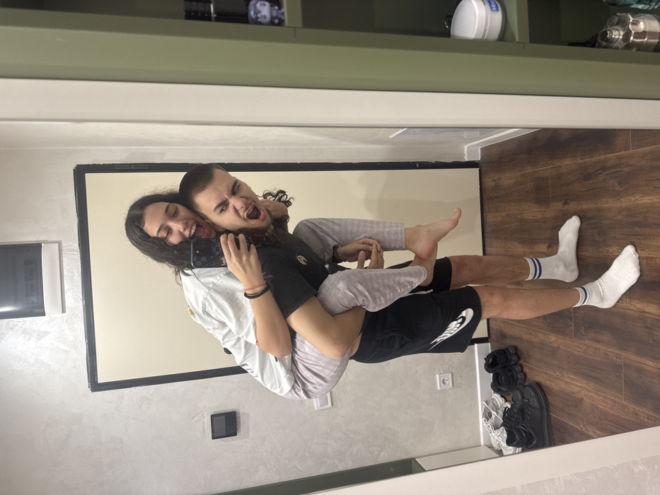 This image, captured in Sofia, Bulgaria, shows two individuals reflected in a full-length mirror within a domestic interior. A male, wearing a dark t-shirt, black shorts with a white Nike logo, and white socks with blue stripes, is carrying a female on his back in a piggyback posture. The female, who is barefoot and dressed in a light-colored t-shirt and patterned light purple sweatpants, has long, dark curly hair. She holds a black smartphone with a checkered case in her right hand, seemingly capturing the mirror image. Both individuals display exaggerated facial expressions with widely open mouths; the male's left eye is squinted. The background features a light gray wall with a dark wood laminate floor. On the wall, a dark gray square thermostat or control panel is mounted, and a white electrical outlet is visible at a lower height. On the floor to the left, several pairs of shoes, including white sneakers and black footwear, are present. In the upper left reflection, a white rectangular wall-mounted dispenser or unit is visible. To the right, partially seen beyond the mirror's frame, is a narrow green shelving unit containing a small figurine and several white containers.