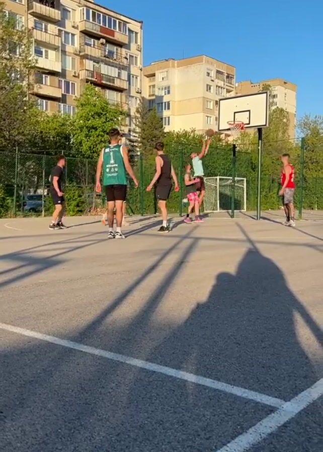 The scene shows a group of six men playing basketball on an outdoor court. The basketball court is paved and marked with white lines, with buildings visible in the background under a clear blue sky. One player, wearing a red tank top, stands near the hoop. Another player in a turquoise shirt jumps in an attempt to make a basket, while the other players observe. The shot is taken from an angle that casts long shadows on the court, including the shadow of the person recording the video. There is a soccer net behind the basketball hoop.