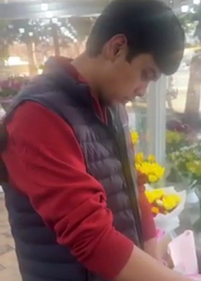 interior of a flower shop. Initially, a young man with dark hair, wearing a red long-sleeved shirt and a dark blue puffy vest, is visible. He is standing near a counter, possibly working on something. The camera pans to show an array of colorful bouquets displayed on stands, including shades of pink, purple, blue and yellow. Some of the bouquets are wrapped in paper and tied with ribbons. The camera then focuses on another person, holding a large bouquet of long-stemmed red roses, standing near a barrel-shaped trash bin and a window. The person is wearing a gray puffer coat and a red knit hat. The environment is brightly lit, and there's a visible street scene outside the shop windows.