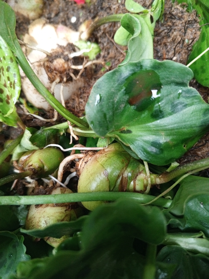 The image features a plant with thick, glossy green leaves, some bearing water droplets. Several bulbous, light-green root structures are visible amidst the foliage. The plant is nestled in dark soil or compost. A spotted leaf is present in the periphery, partially obscuring a cluster of pale, root-like structures. The overall impression is of a healthy, well-watered plant.