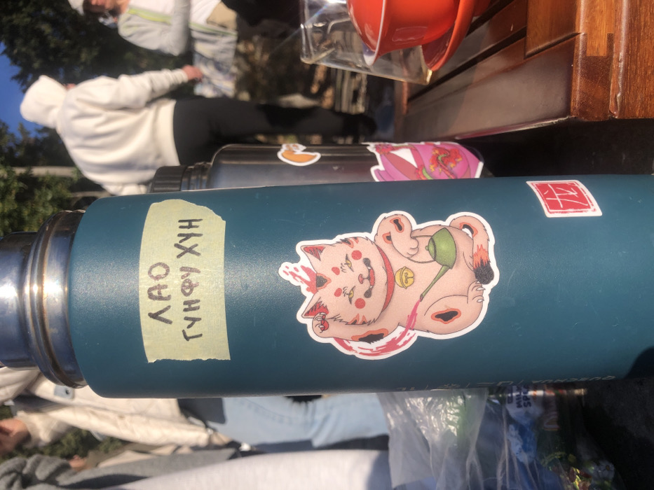 A teal thermos with multiple stickers rests on a surface, possibly a table. A sticker depicts a pink cat-like figure with a bell collar, emitting streams of red liquid from its head and body. Another sticker is a square with a red symbol inside. A piece of tape is affixed to the thermos, bearing what appears to be handwriting. Other objects and people are in the background, slightly blurred and out of focus.