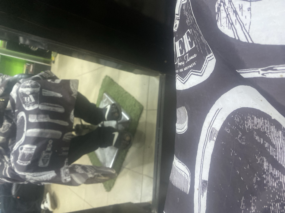 The image depicts an indoor scene from a barbershop or salon, captured through a partial direct view and a mirror's reflection. In the foreground, the lower portion of a dark-colored barber's cape with white patterns of barber tools (e.g., razors, combs, clippers) and a white label reading "FEFE Luxury Tissue" with "SOFTNESS" is directly visible. The reflection in the mirror, which occupies the upper half of the image, shows a person seated in a barber's chair. The reflected individual wears black trousers and dark sandals featuring a white Nike swoosh logo on the strap. They are covered by a similar barber's cape, patterned with various grooming implements. The person's feet rest on a metallic footrest of the barber chair, which is positioned on a small square mat of green artificial turf. The floor around the mat appears to be light-colored, possibly tiled. In the blurry background of the reflection, a green wall or surface is discernible, along with other indistinct objects, including what appears to be a white bag and another shoe. The scene's specific location within Jos, Nigeria, is not identifiable from the visual information provided in the image.