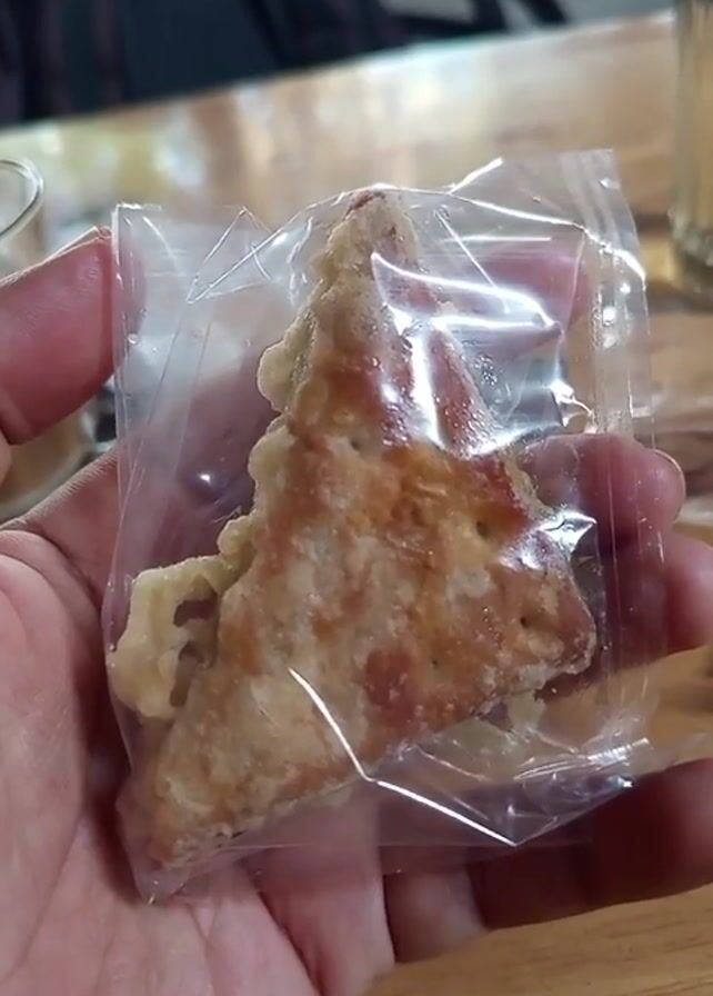 A hand holds a triangle-shaped fried food item packaged in clear plastic