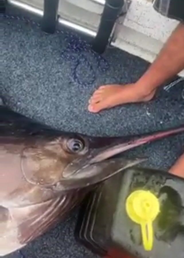 large marlin that has been caught and brought onto a boat. The fish is lying on the deck, and its size is evident as the camera pans from its head to its tail. Someone is standing next to the fish. The marlin is secured with ropes. The video ends with a shot of a young man on the boat, looking out at the ocean. The sea is visible, and it appears to be a cloudy day.