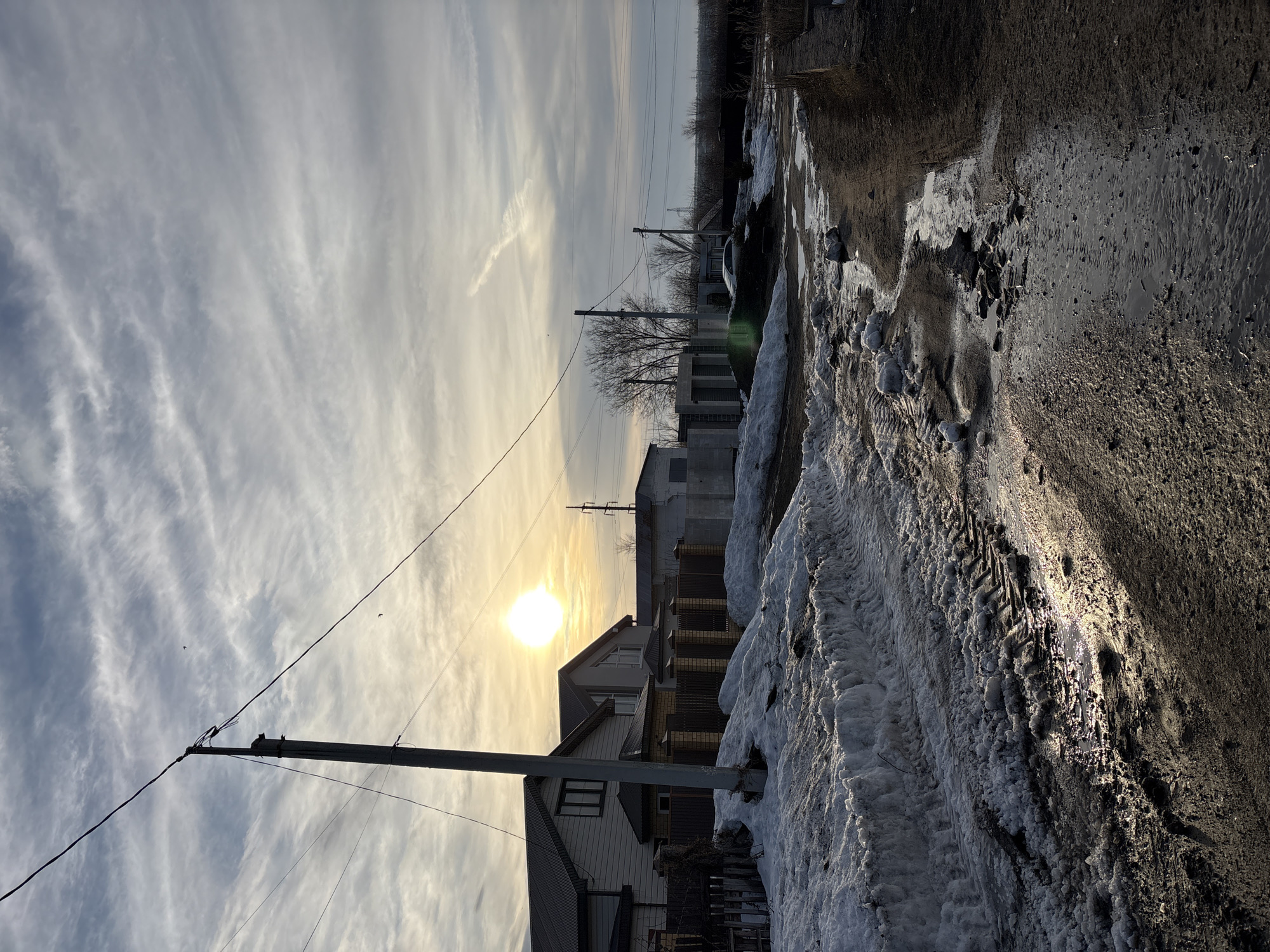 The image depicts an unpaved residential street in Ulyanovsk, Russia, under an overcast sky during what appears to be late winter or early spring. The sun, low on the horizon, is brightly visible in the mid-left, casting a warm glow and reflections on the ground. In the foreground, an unpaved, muddy road is characterized by significant snowmelt, resulting in numerous puddles and flowing water channels. Tire tracks are evident in the mud and remaining snow patches. Along the immediate left edge of the road, a substantial bank of melting snow is present. A dark utility pole with multiple overhead power lines stands prominently in the mid-left foreground. Behind it, two modern-style houses with dark pitched roofs, light-colored siding, and visible windows are situated. These houses are fronted by a fence constructed from dark panels and brick pillars. Further down the street on the left, another building, possibly a garage or workshop, is partially visible. To the right of the road, a silver-colored sedan is parked behind a low barrier. Beyond the vehicle, construction materials are stacked near a partially completed concrete structure. The background features bare deciduous trees and additional utility poles, with distant power line structures visible against the horizon. The sky exhibits elongated, wispy cloud formations. No individuals or animals are present in the scene.