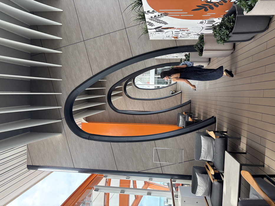 This image depicts an open-air lounge area on a modern cruise ship, reportedly situated in the Berry Islands, Bahamas. The environment features a sequence of curvilinear architectural arches with thick black frames, integrated into walls paneled with light beige wood-grain material. Several arches incorporate vibrant orange vertical accent panels. The ceiling above consists of parallel white slats, and the deck flooring is composed of light brown planks. On the left side of the walkway, multiple dark gray lounge chairs with light gray pillows and light wooden armrests are arranged with accompanying dark gray low tables. Beyond these, a transparent and orange structural element, possibly part of a waterslide, is visible, offering a view of turquoise water and a clear sky. Along the right side of the walkway, various planters containing green foliage are positioned. A wall section on the right displays a white panel adorned with abstract black botanical illustrations and a large orange circular design. A single female individual is captured from behind, walking away from the camera down the center of the deck. She has long, dark hair and is wearing a dark, polka-dotted maxi-dress with thin straps and dark flat shoes. She carries a light blue garment over her left forearm and holds a white-cased smartphone in her right hand. Her head is turned slightly to her left.