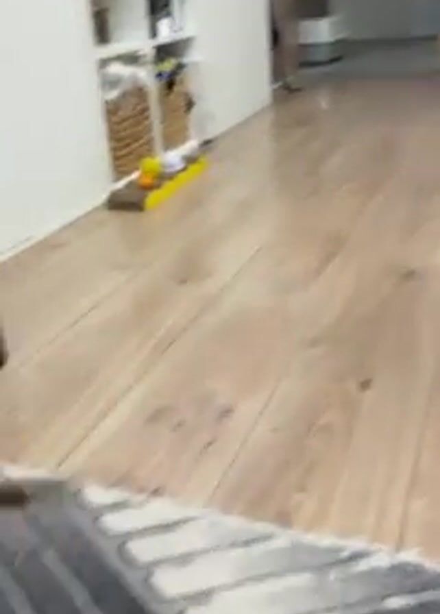 A small, brown, fluffy puppy runs towards the camera on a light wooden floor. The puppy’s fur is slightly blurred, indicating movement. In the background, there is a white cabinet, a shelf with items, a black coat rack, and a doorway leading to another room. A patterned rug is visible in the foreground. The lighting is adequate for clear visibility.