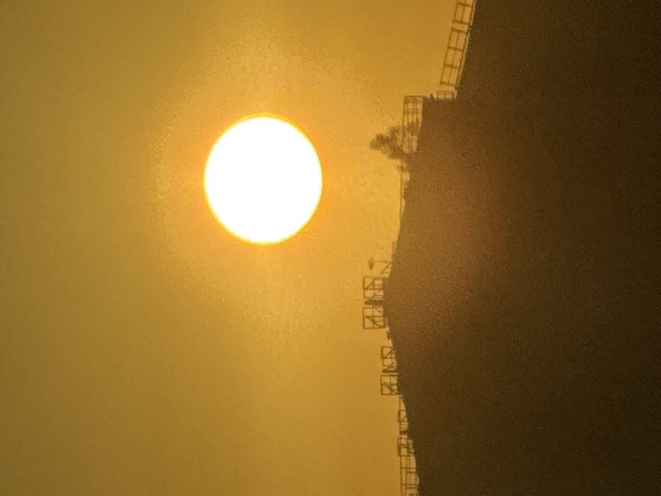 A blazing sun dominates the left side, casting a golden haze across the scene. To the right, a dark, textured cliff face stands in stark contrast. A series of evenly spaced, cage-like structures appear along the cliff's edge, diminishing in visibility as they recede into the darkness. The overall effect creates a sense of stark beauty and perhaps a hint of isolation.