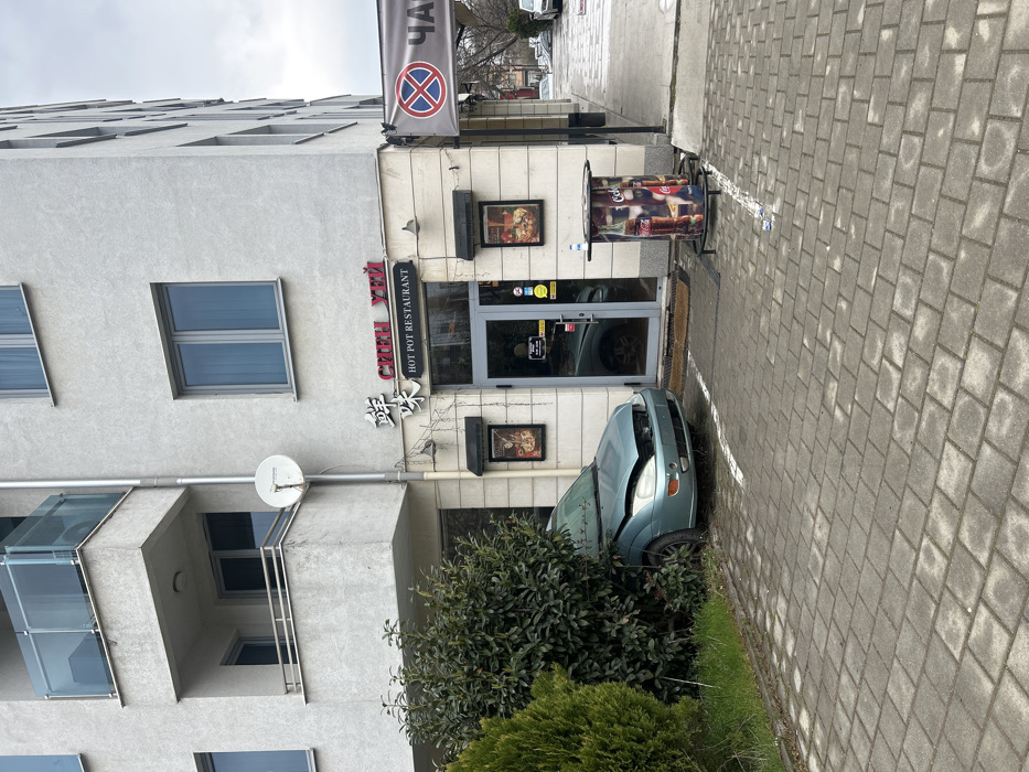 The image displays a street scene in Sofia, Bulgaria, featuring the ground floor corner of a light grey, multi-story building. The commercial establishment on the ground floor is "鮮味 СИЕН УЕЙ HOT POT RESTAURANT," identified by its trilingual signage. A glass double door serves as the entrance, flanked by two framed posters under small awnings. A white satellite dish is mounted on the building's facade above the restaurant sign. In the left foreground, a teal-colored first-generation Ford Focus is positioned with its front end partially driven into a dense, dark green bush. The vehicle's front bumper is missing or severely damaged, and its hood is open or dislodged, exposing internal engine components. The ground surface in the foreground is paved with grey rectangular pavers, marked with white lines indicating a parking space. A small patch of grass is visible next to the bush. To the right of the restaurant entrance, on the paved area, stands a cylindrical fixture branded with Coca-Cola logos, topped with a blue bottle. Further to the right, a "No Stopping" sign (red circle with a diagonal line) on a pole, accompanied by a partial banner displaying Cyrillic text, is visible. The sky is overcast. No people are present in the scene.