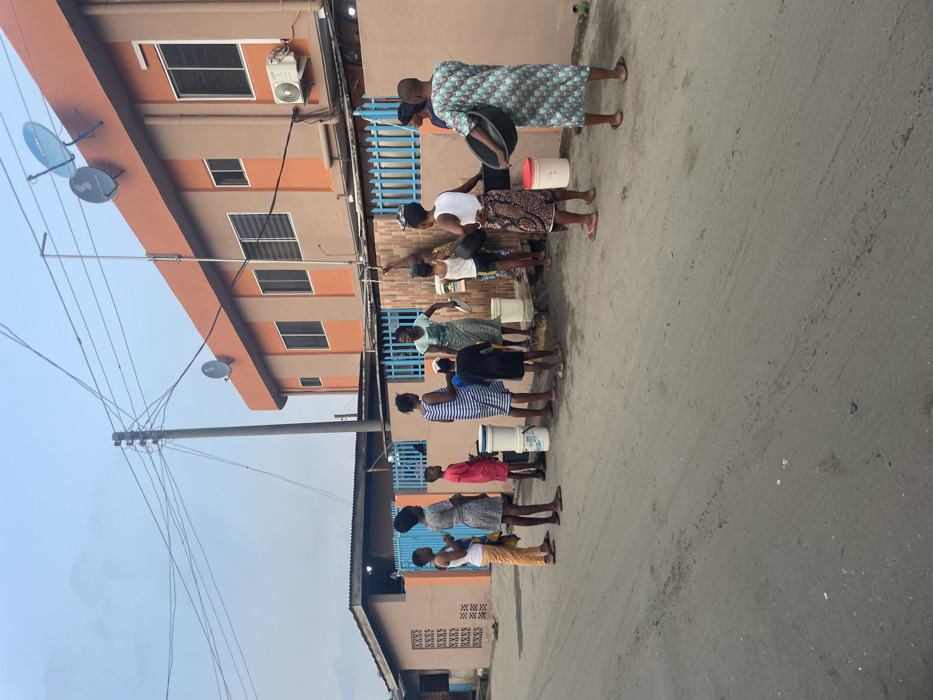 A line of women stands on a street, each with a bucket. The women wear a variety of clothing. Buildings line the street, including one with an air conditioning unit and satellite dishes. Power lines are visible in the sky. The sky appears to be overcast.