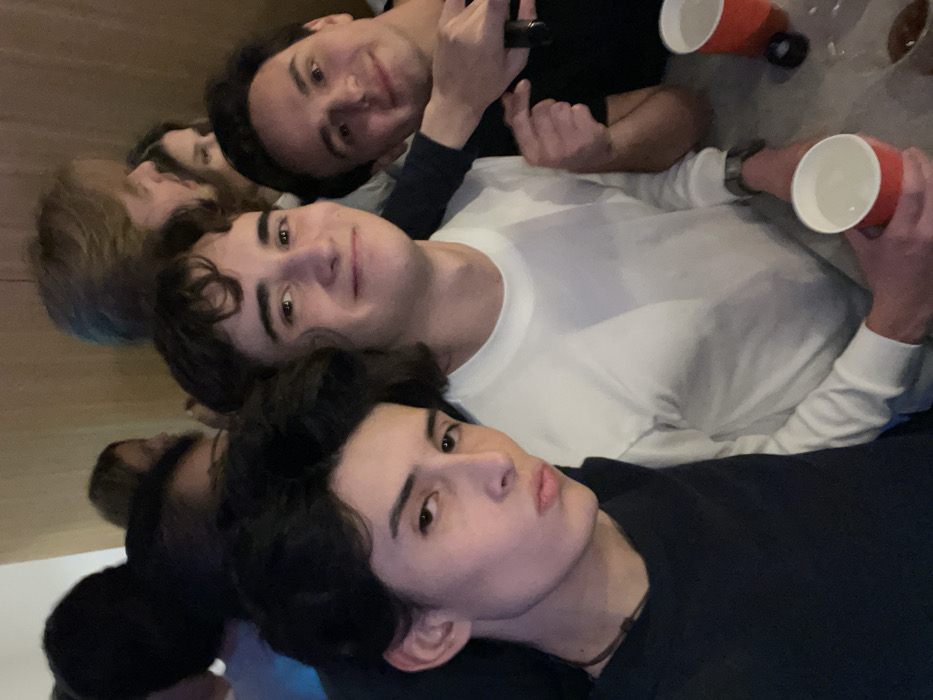 A group of people, mostly young men, are laying on the floor, posing for a selfie. Three men are prominent in the foreground, one wearing a black shirt, one a white shirt, and another a black shirt. They all have dark hair. Red cups, some empty, are scattered around. Additional faces are visible behind them. The setting appears to be a casual gathering.