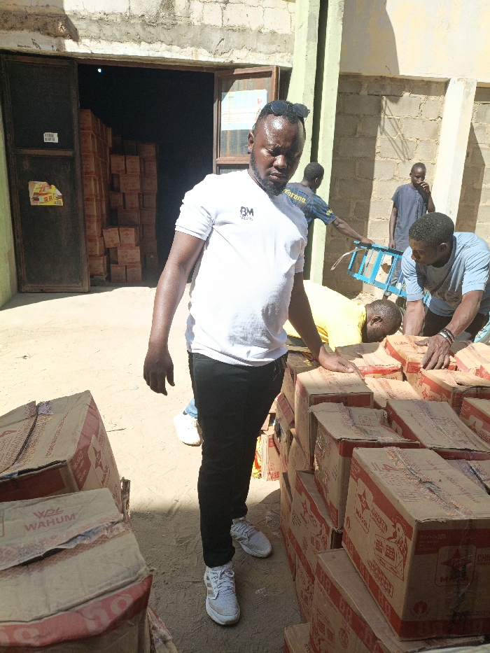 The scene, located in Fagge A, Nigeria, depicts an outdoor commercial area adjacent to a building. Six male individuals are present, engaged in handling and moving cardboard boxes under bright sunlight. In the foreground, a dark-skinned man with a beard and short dark hair stands, looking towards the right. He wears a white short-sleeved t-shirt with a "BM REAL" logo, black trousers, and light-colored athletic shoes. Sunglasses are perched on his head. His right hand rests on a stack of brown cardboard boxes. To the immediate right of the foreground man, a man in a light blue short-sleeved shirt is bent over, arranging or lifting boxes. Behind him, a man in a yellow t-shirt is similarly bent over, interacting with boxes. Further back, a man in a dark t-shirt with visible "Corona" branding is positioned over a blue metal frame, possibly a hand truck or dolly. Another man stands in the background against a light-colored wall. A sixth individual's legs, wearing light-colored pants and white shoes, are partially visible behind the foreground man. Numerous brown cardboard boxes, many marked with red printing and indicating "MAGGI CHICKEN" and "WAHUM" brands, are stacked on the unpaved dirt ground. More boxes are visible stacked high inside an open doorway to the left, which has a screen-door style panel partially open. The building is constructed of unplastered concrete blocks, with a vertical green structural element on the right. Strong shadows are cast on the ground.