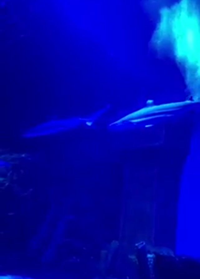 n underwater scene, possibly in an aquarium, illuminated with a blue light. Several sharks swim slowly through the water, and other fish are visible, including one with black and white stripes. The underwater environment includes what appears to be coral and a submerged structure, potentially a shipwreck. The scene is mostly dark due to the blue lighting.
