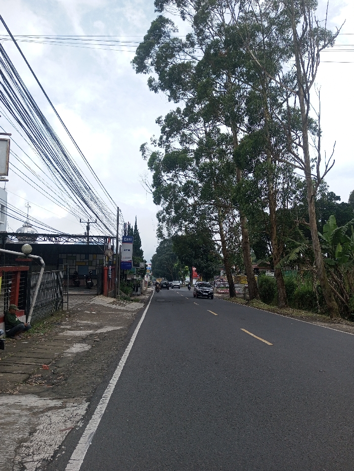 This image depicts a street scene in the city of Sandamal Eliya, Sri Lanka, captured under an overcast sky. On the left side, a worn concrete sidewalk runs parallel to a low red and black metal fence. A lone individual, dressed in green, sits on the ground with their back partially to the viewer, positioned against the fence line near the foreground. Behind the fence, a building features a distinctive facade composed of multi-colored rectangular panels. Above this structure, a gray dome and numerous black utility wires are visible, crisscrossing against the sky. A blue commercial sign displaying "BRI" and "ATM" in white text is mounted on a pole near the building, alongside some tall, slender coniferous trees. The asphalt road, marked with a solid white line on its left shoulder and double broken yellow lines in its center, occupies the middle and right sections of the frame. Multiple vehicles are traveling away from the camera, including a dark-colored SUV prominently in the midground, and other cars and motorcycles further down the road. The right side of the road is densely lined with several tall, mature trees featuring green foliage, characterized by their straight, slender trunks. Behind these trees, additional green vegetation, including what appears to be banana plants, contributes to a lush natural environment.