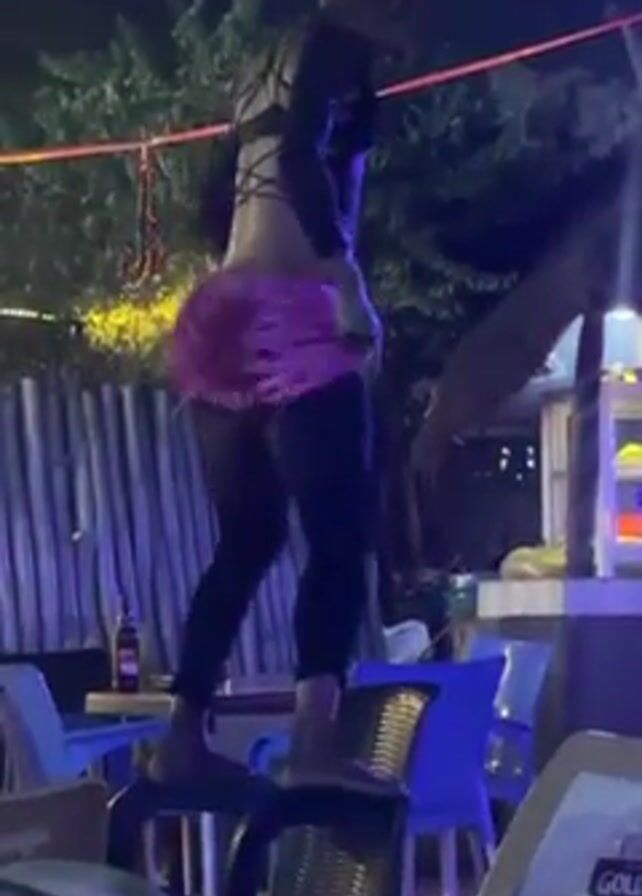 person wearing a blonde wig, a long-sleeved black top with a criss-cross design on the back, black leggings, and a short, pink frilled skirt. They are standing barefoot on two stacked plastic chairs on what appears to be a patio or outdoor bar area at night. The person is swaying and appears to be dancing to music, as indicated by the beat and song playing in the background. Surrounding them are tables and chairs, some lit up with blue lighting. A fence is visible in the background, along with trees and string lights. A bottle of wine sits on a table nearby.