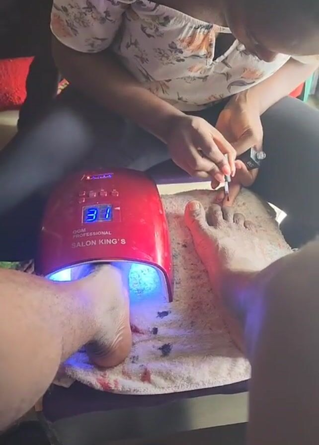 woman applying nail polish to a person’s toenails. The woman is wearing a floral blouse and black pants. She is sitting and using a small brush to apply the polish. The person whose toenails are being painted has one foot under a red “Salon King’s” UV light. The device’s digital timer display shows the number 28. The foot is resting on a towel. The person is also wearing gray sandals. The floor is visible.