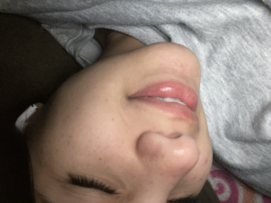 The scene depicts a close-up, angled view of an individual resting indoors in the city of Cotoperíz, Venezuela. The subject's head is tilted to the right, presenting the left side of their face. Their eyes are closed or partially closed, revealing dark eyelashes. Freckles are scattered across the nose and upper cheeks. The individual's lips are slightly parted, appearing glossy with a pink hue, showing a hint of teeth within. A light gray short-sleeved t-shirt is worn, with a thin, light-colored chain visible around the neck. A small white object is partially discernible at the upper left, near the top of the head. To the lower left of the frame, a segment of pink and white patterned fabric is present. The background elsewhere is dark and undifferentiated.
