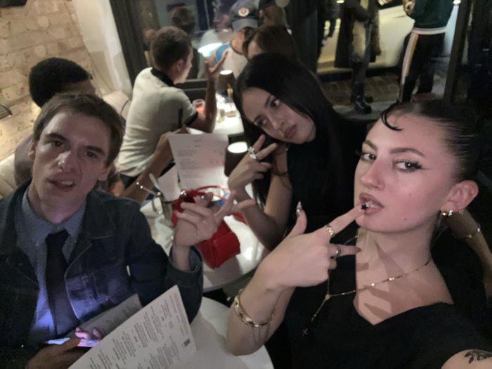 The image depicts an indoor evening scene within a restaurant or bar, with a large window or opening revealing a city street at night. The urban environment is consistent with London, United Kingdom. Three individuals are prominently featured in the foreground, seated at a white table. On the left, a male in his 20s, with short brown hair, wears a denim jacket over a light blue shirt and dark tie. He holds a smartphone with a glowing screen in his left hand and a white menu in his right, looking directly at the camera with a slightly open mouth. To his right, a female in her 20s with long, dark hair and a dark top, displays a 'peace' sign with her ring-adorned left hand, also looking towards the camera. On the far right, another female in her 20s, with dark hair styled back and wearing a dark top, touches her lower lip with her ring-adorned right index finger, maintaining direct eye contact with the camera. She wears multiple rings, earrings, bracelets, and a long gold necklace. On the table in front of them are several white menus and a small red handbag. In the mid-ground, other patrons are visible, including a male in a light polo shirt with his arm raised, seated at another table. The background outside the establishment is dark, indicating nighttime, and features a white car, a dark car, and several blurred pedestrian figures on a street, illuminated by distant light sources. An exposed brick wall is visible on the interior's left side. The overall lighting is dim and warm, characteristic of an evening dining or social setting.