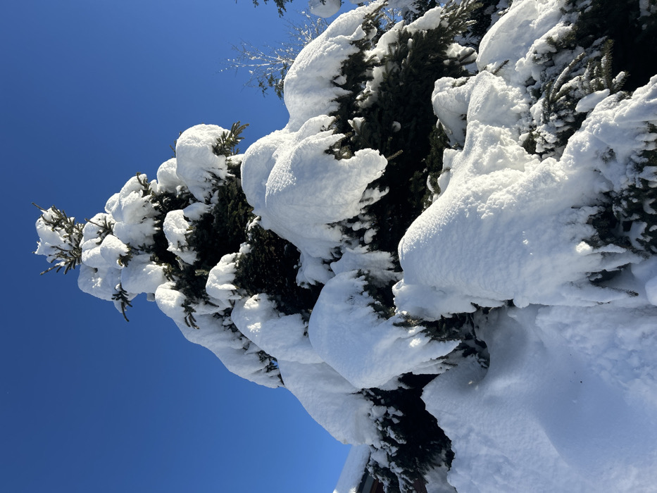 A vibrant blue sky serves as the backdrop for a snow-laden evergreen tree