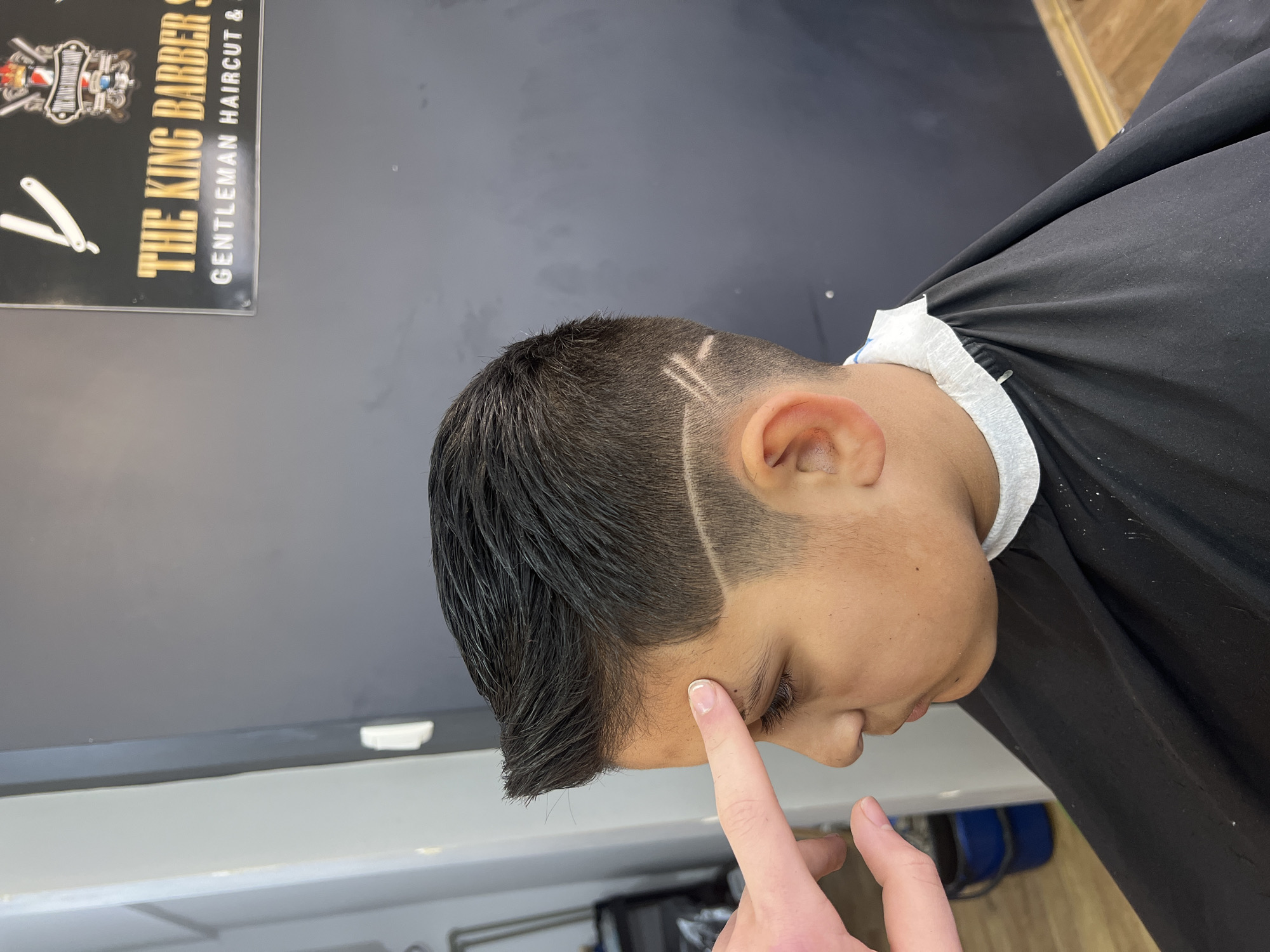 A medium shot depicts a young boy with a fresh haircut sitting in what appears to be a barber shop. The boy has dark hair styled with a side part and a shaved design on the side of his head. He is wearing a black barber's cape with a white neckline. A hand with pale skin is pointing towards the boy's face. Behind the boy, a sign is partially visible which reads "THE KING BARBER...GENTLEMAN HAIRCUT &...". The background is a combination of gray and white walls. The floor is covered in light-colored wood. The image does not provide any location in the city of Kazanlak, Bulgaria.