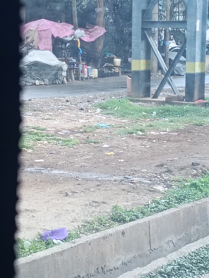 scene of urban poverty. A makeshift dwelling covered with a pink tarp stands near a road, alongside a metal support structure painted with yellow bands. The ground is littered with trash and debris. A concrete barrier runs along the foreground, with a discarded purple bag visible. The overall impression is one of neglect and difficult living conditions.