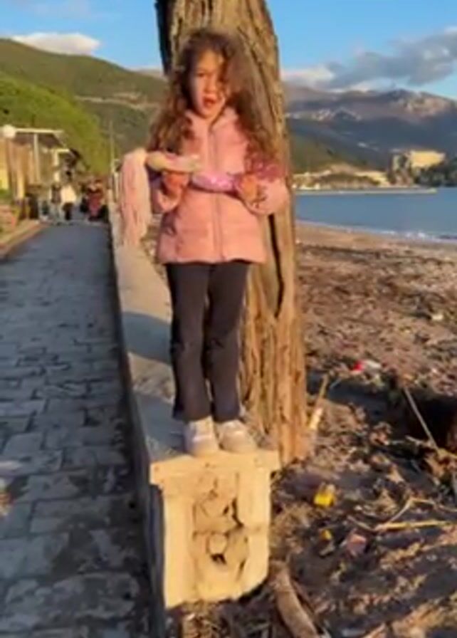 A young girl with curly hair is standing on a small, concrete wall adjacent to a paved walkway. She is wearing a pink puffy jacket, dark pants, and white shoes. She is holding a toy item that appears to be a doll or toy horse with a pink and purple mane and tail. Behind her is a beach area littered with debris, a body of water, and a mountainous landscape. To her left, a few people are walking along the walkway. A large tree trunk is visible behind her, and the scene is bathed in golden sunlight, suggesting it is either sunrise or sunset. The sky is blue with some clouds. The beach area shows signs of recent flooding or storm damage due to the debris scattered around.