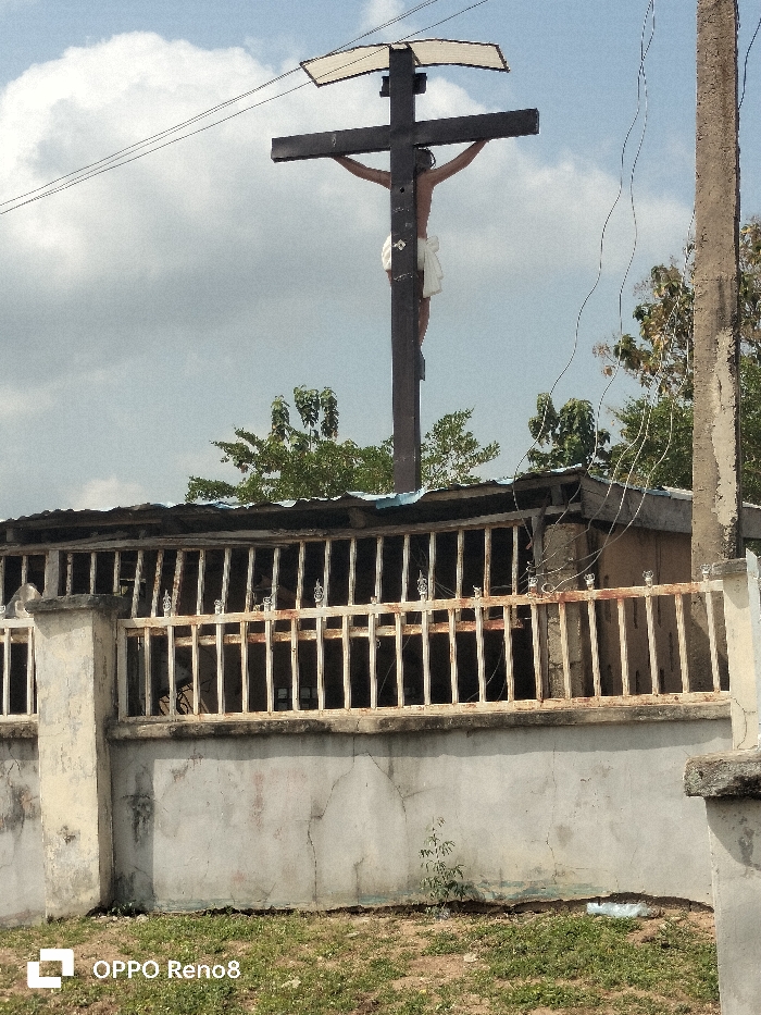 A large crucifix stands prominently against a partially cloudy sky in Adankolo, Nigeria