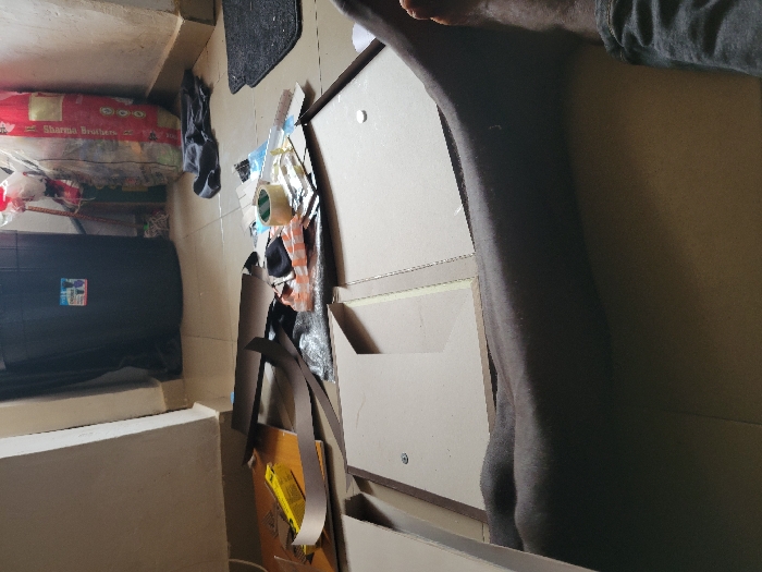 The image depicts an indoor scene within the city of Puerto López, Colombia, characterized by a cluttered tiled floor and a dark-skinned individual's lower leg and bare foot. The leg, clad in dark trousers, extends horizontally from the bottom right of the frame, resting amidst light-colored cardboard panels. One panel features a visible white circular object. Adjacent to the leg, a dark fabric item is partially discernible. The midground is occupied by scattered items including a yellow object, various paper and plastic scraps, metallic foil, a roll of adhesive tape, and a small dark fabric item. A black floor mat is visible on the far right. The background features a light-colored wall against which a large black cylindrical waste bin, bearing a "Hogar Saludable" label, is positioned. To its right, a transparent plastic bag containing unspecified items and a red and white striped sack, labeled "Sharma Brothers" and "Est. 1980" (suggesting a Basmati rice product), are visible. The environment suggests a domestic or workspace setting in a state of disarray.
