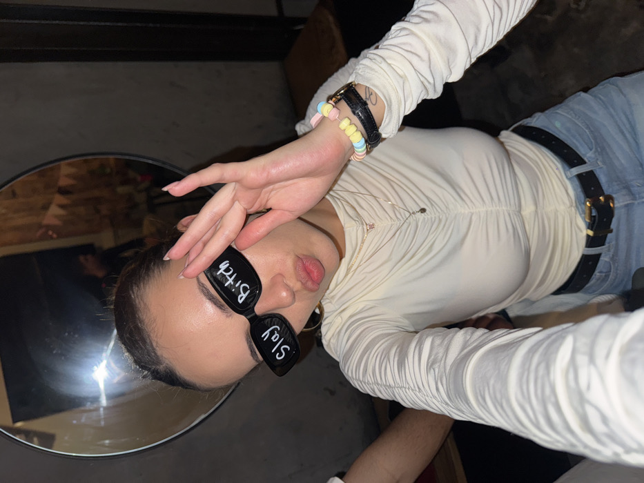 A person poses for a selfie in front of a mirror, wearing sunglasses labeled "Bitch" and "Slay