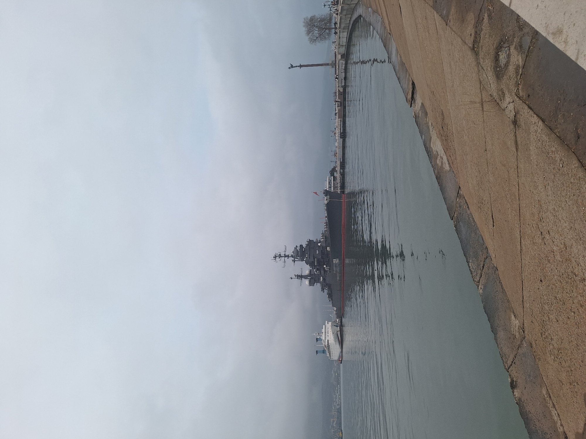 The image displays a wide view of the waterfront in Novorossiysk, Russia, under an overcast sky. The foreground features a concrete embankment with a curvilinear edge, showing signs of dampness at the waterline. The water surface is calm, grey, and reflects the surrounding elements. In the midground, two large ships are moored alongside a straight pier. Dominating the left-center is the dark grey hull and superstructure of the cruiser *Mikhail Kutuzov*, identifiable by the white number "105" on its bow. To its immediate left, a smaller, white passenger ship or ferry with blue and white smokestacks is also docked, with a red-hulled tugboat partially visible between the two vessels. The pier extends towards the right, populated by several indistinct human figures walking along its length. Towards the far right end of the pier, a tall, dark monumental column topped with a winged figure stands prominently. Adjacent to the monument on the right, a large deciduous tree with bare branches suggests a cooler season. The background on the left reveals distant, undulating hills or mountains partially obscured by the low-hanging, grey cloud cover. Further industrial structures and smaller vessels are faintly visible along the distant shoreline. The overall atmosphere is subdued due to the uniform grey sky and calm waters.