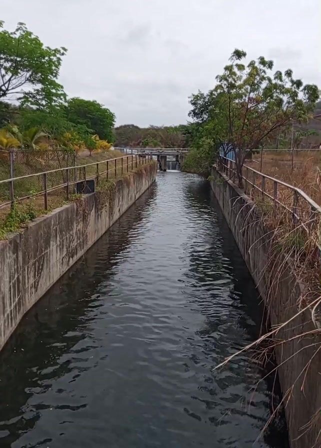 long, narrow canal filled with water. The canal is lined on both sides with tall concrete walls. A metal railing runs along the top of each wall. There is some greenery and trees on either side of the canal. A small waterfall can be seen in the distance, where the water flows over a structure. The sky is overcast.
