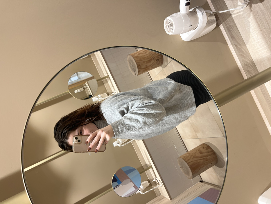 A female individual is visible in a selfie taken through a large, circular, gold-framed mirror within a modern facility in Marcq-en-Barœul, France. The specific establishment within Marcq-en-Barœul is not identifiable from the image. The individual, appearing to have damp, dark brown, shoulder-length hair, wears a light grey, possibly pilled, turtleneck sweater and a dark, presumably ribbed, bottom garment. She holds a light-colored smartphone (equipped with a triple camera array) in her right hand, obscuring her upper face, with visible fingernails featuring a leopard print pattern. Her exposed lower face and eye suggest a slight smile. The mirror reflects a background consistent with a contemporary public restroom or changing area. This environment features warm beige/tan walls and a matching neutral-toned tiled floor. A light-colored countertop runs along the back wall, above which are mounted several smaller circular mirrors. One small mirror reflects an abstract, multi-colored design, while another reflects part of the room, possibly another vanity area or a wall-mounted fixture. White wall-mounted dispensers or fixtures are visible on the countertop below these mirrors. Two natural wood log-stools serve as decorative elements on the floor behind the counter. Vertical gold-colored metal accents are integrated into the wall design. Outside the main mirror's reflection, to the right, a white Valera Swiss Q wall-mounted hairdryer with a coiled power cord is affixed to the beige wall. The floor in the foreground matches the reflected tiled floor, and a golden-colored stand for the main mirror is partially visible at the bottom.