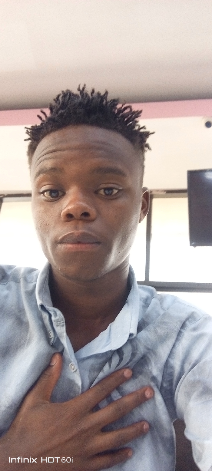 A vertical portrait photograph captures a young Black male, approximately in his late teens or early twenties, from the chest up. He has dark skin, brown eyes, and short, dark, kinky hair styled upwards. His expression is neutral as he looks directly into the camera. He is wearing a light blue, collared, long-sleeved button-up shirt, with the top buttons unfastened. His right hand is placed flat against his chest, fingers splayed. The background indicates an indoor setting with a light-colored wall or ceiling. To the right of the subject's head, a dark, rectangular flat-screen object, likely a television or monitor, is visible, possibly wall-mounted. Above and slightly to the right of this object, a small, dark, dome-shaped security camera is affixed to the ceiling or upper wall. A dark horizontal line or frame element is also present in the right background. The specific location within Nairobi, Kenya, is not discernible from the visual content. The image contains a "Infinix HOT 60i" watermark in the lower left corner.